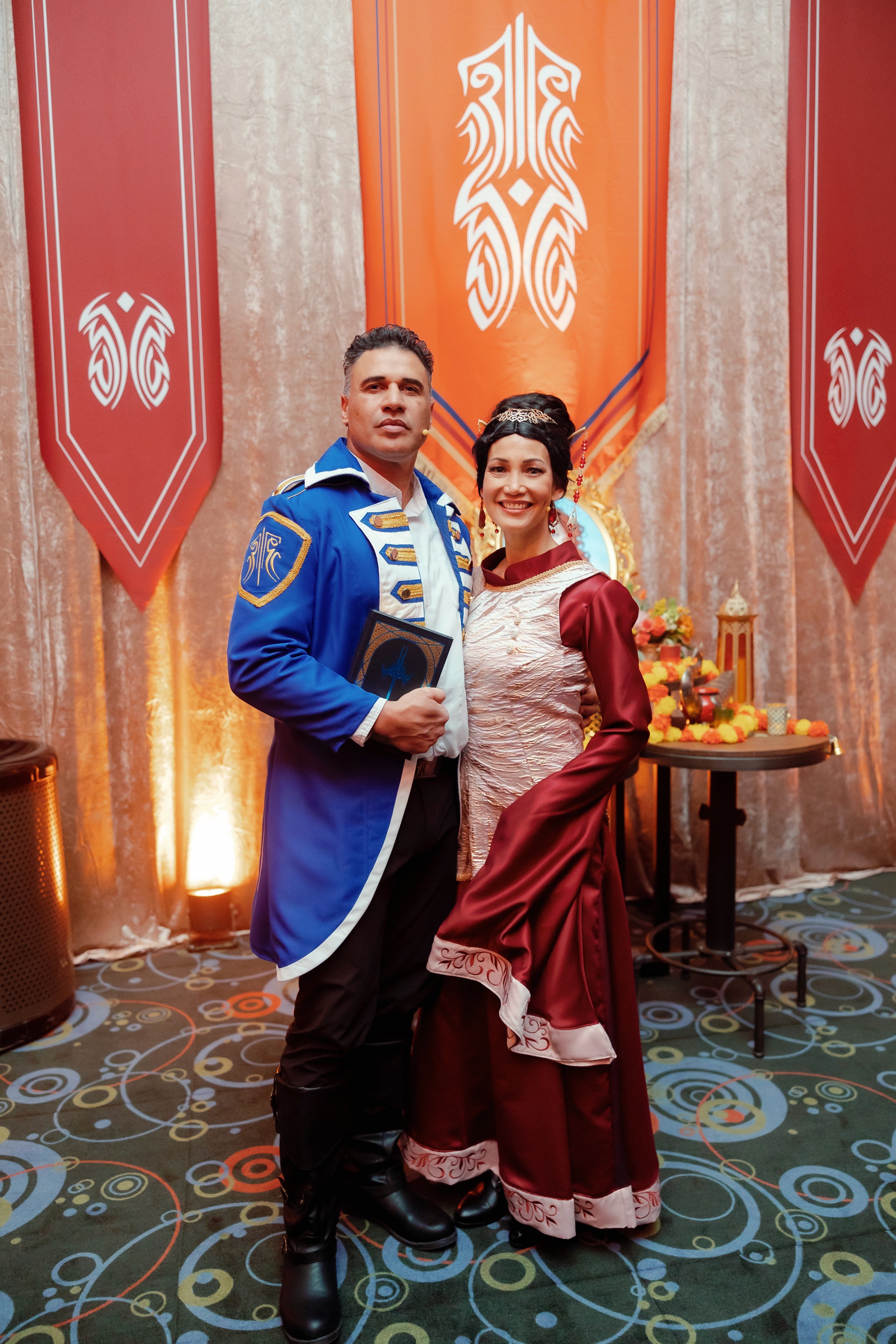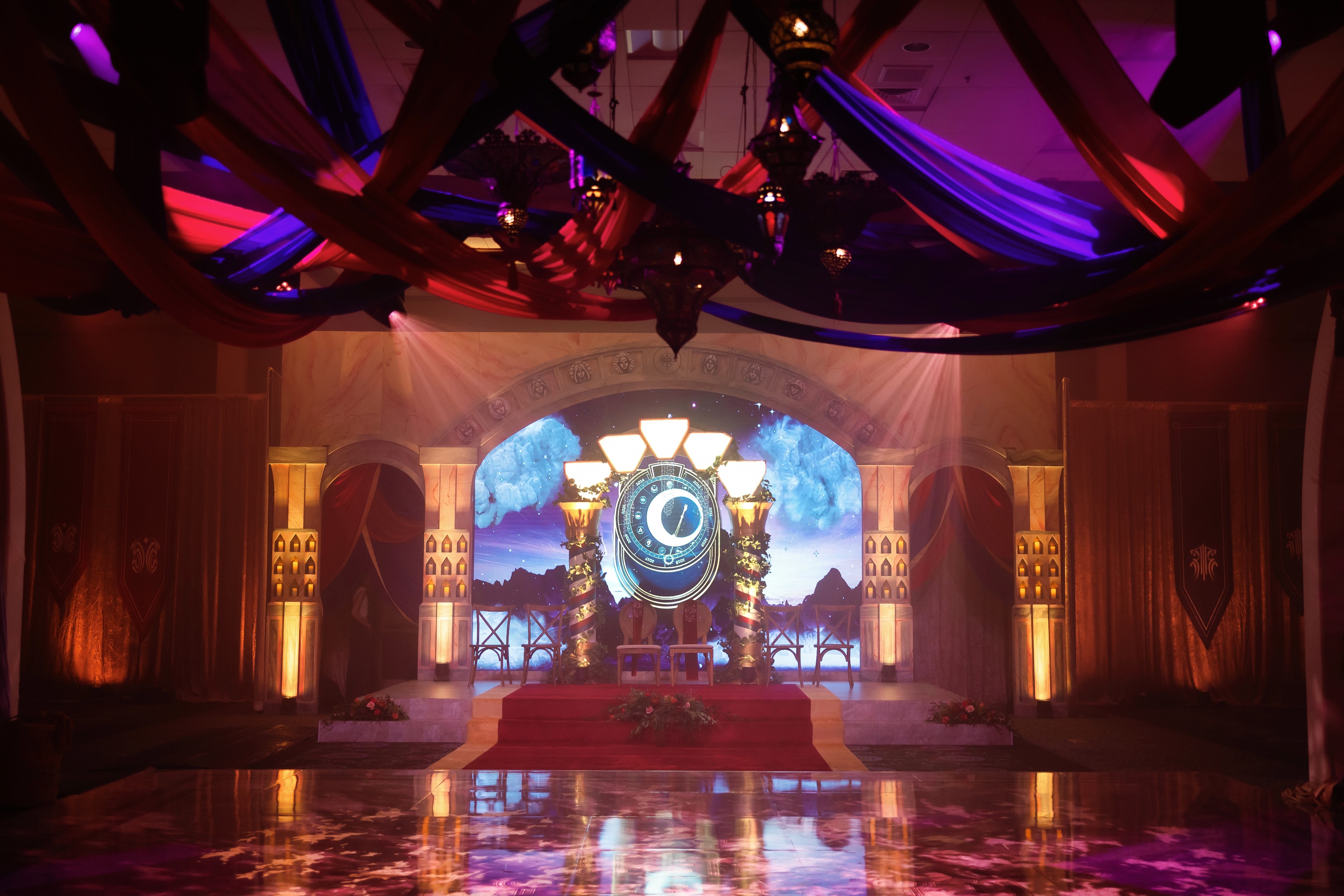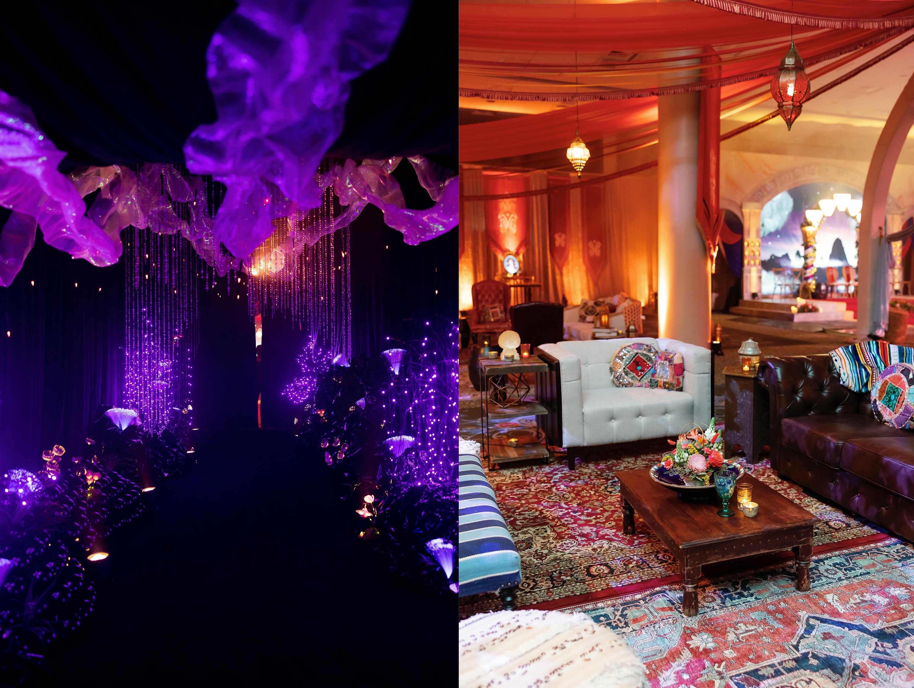 The challenge of bringing the Worldhopper Ball to life was aside from the rich descriptions in the books, there was not as much official artwork or a film/TV adaptation to go off of. We spent months researching the texts, compiling a list of descriptors to fill out the vision of this world. The cultures of Roshar are a blend of cultures found on Earth so we stretched across the globe for a combined result from Mongolia, Morocco, East Asian, Middle Eastern, French in the Second Empire, Indian Royal, and a smattering of Eastern European. This was reflected not only in the footprint and decor, but the drape, costumes, and food as well. With each detail carefully chosen, the result was a rich melting pot of light and color, lending to the celebratory nature of the wedding.