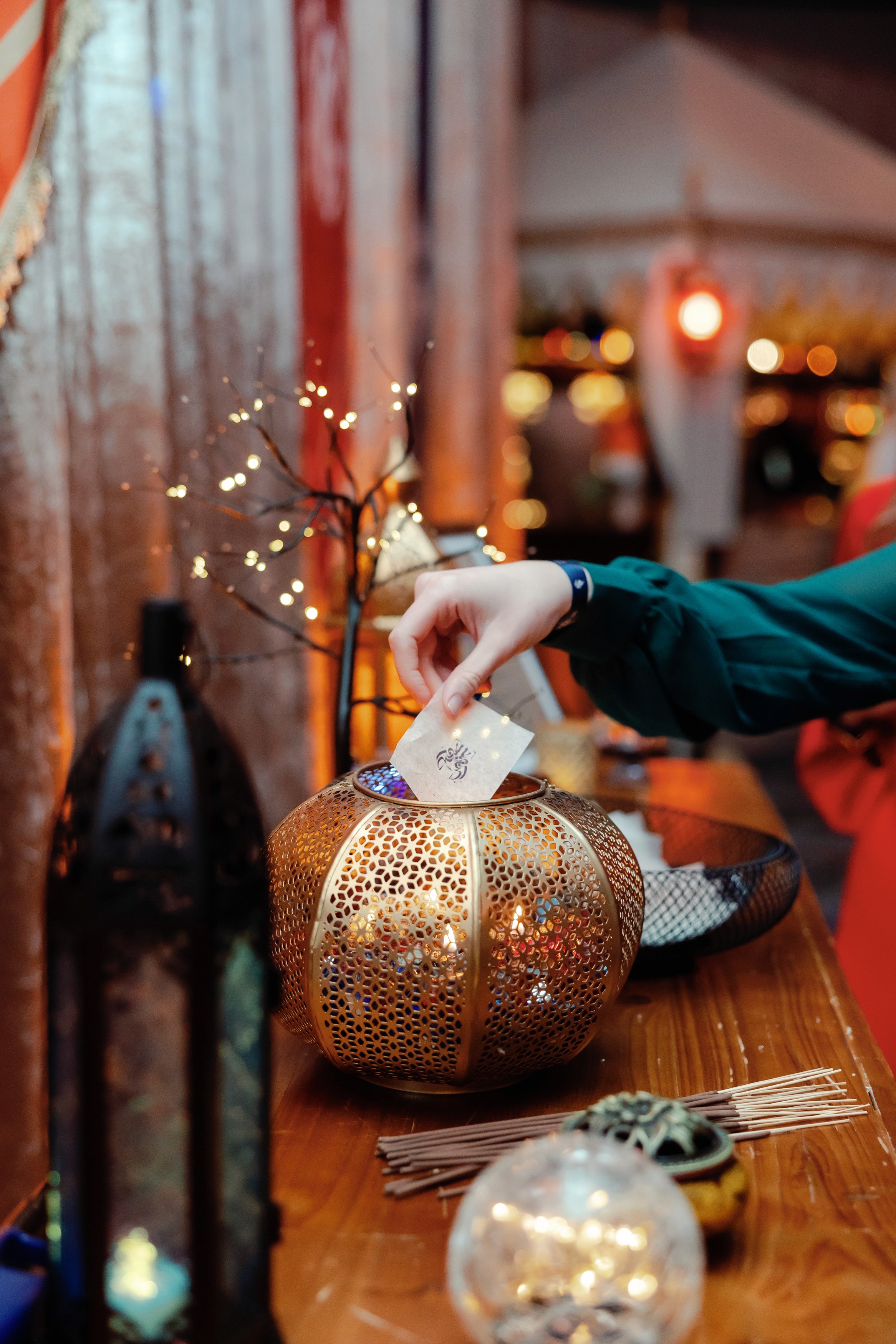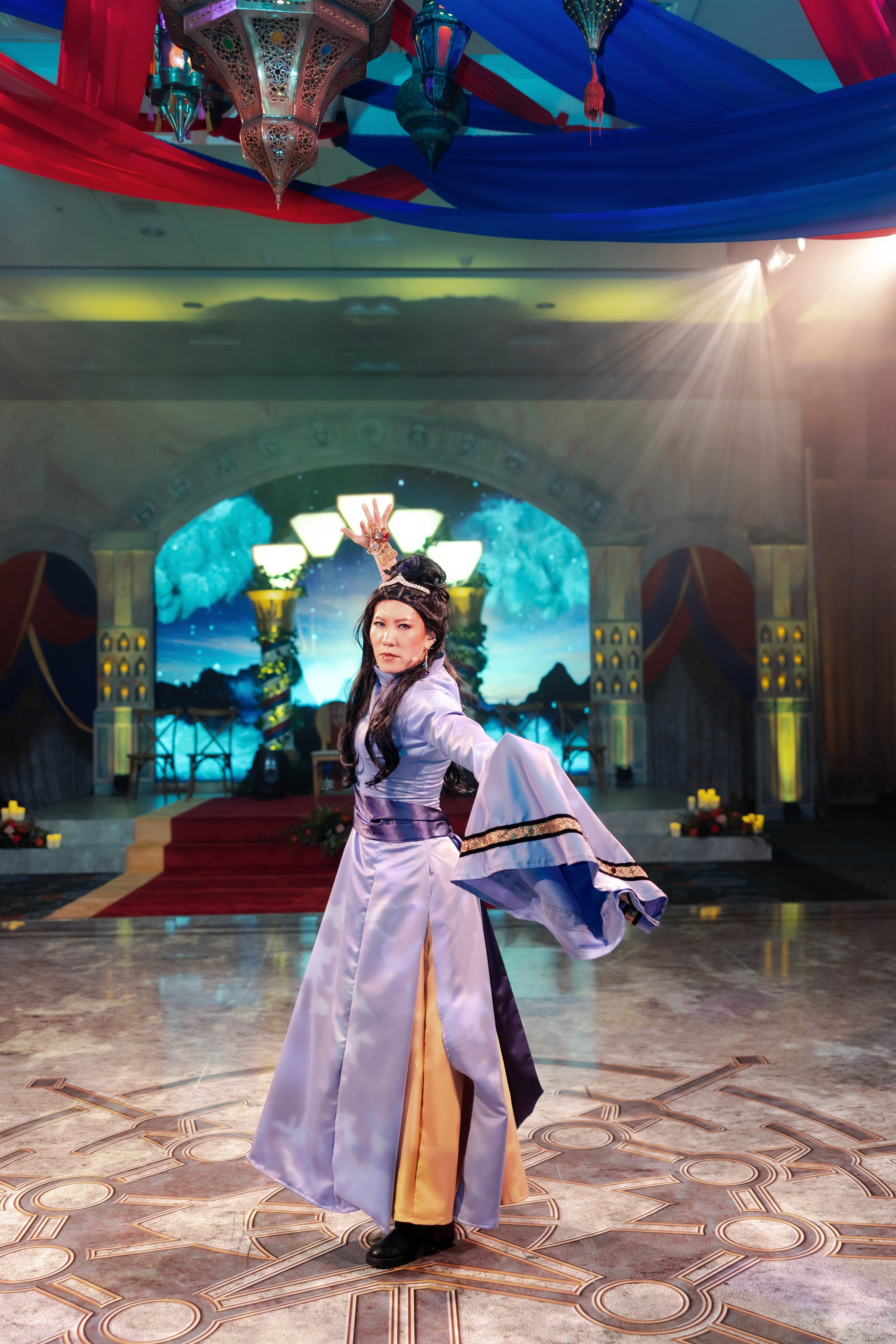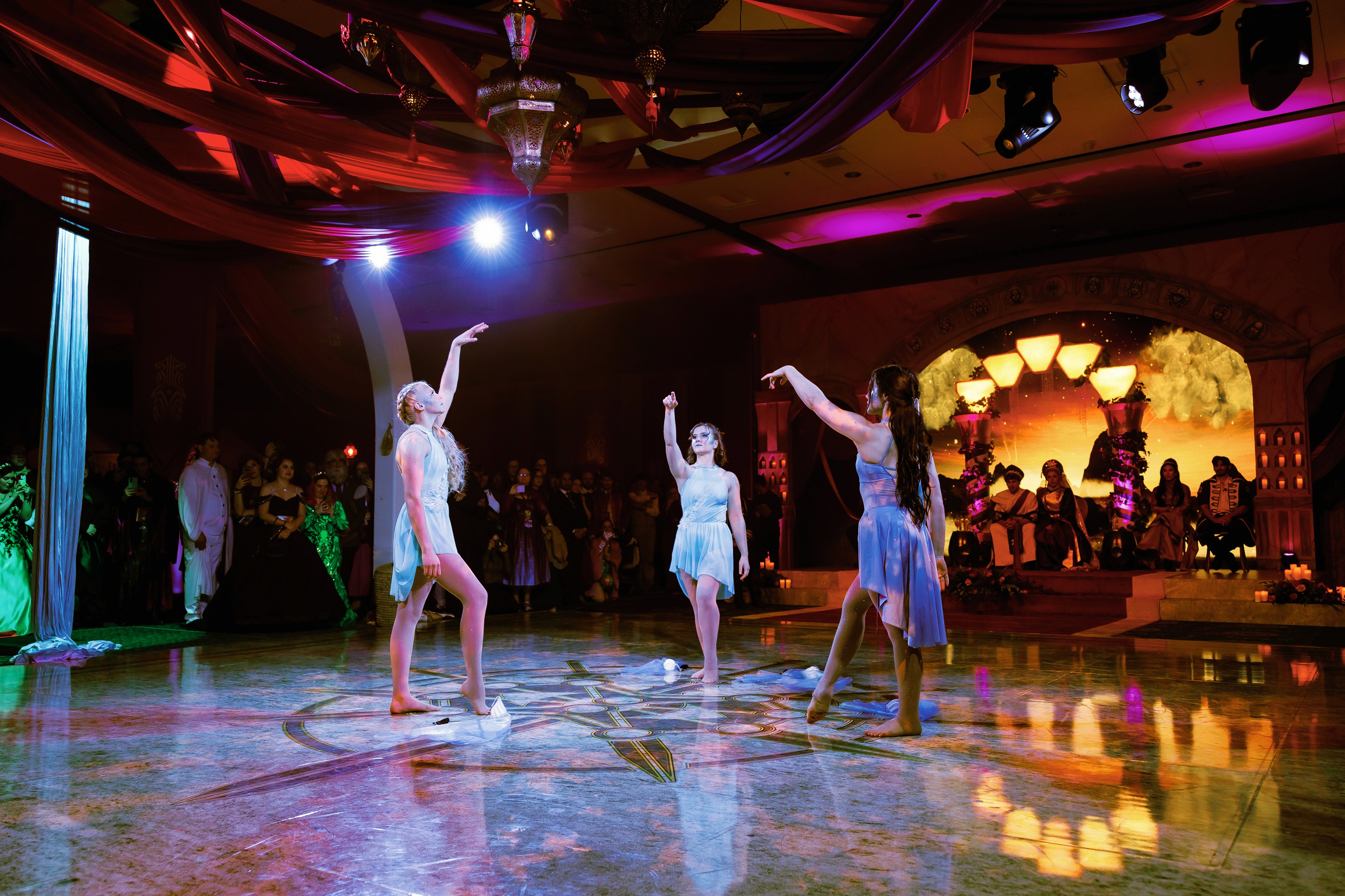 The challenge of bringing the Worldhopper Ball to life was aside from the rich descriptions in the books, there was not as much official artwork or a film/TV adaptation to go off of. We spent months researching the texts, compiling a list of descriptors to fill out the vision of this world. The cultures of Roshar are a blend of cultures found on Earth so we stretched across the globe for a combined result from Mongolia, Morocco, East Asian, Middle Eastern, French in the Second Empire, Indian Royal, and a smattering of Eastern European. This was reflected not only in the footprint and decor, but the drape, costumes, and food as well. With each detail carefully chosen, the result was a rich melting pot of light and color, lending to the celebratory nature of the wedding.