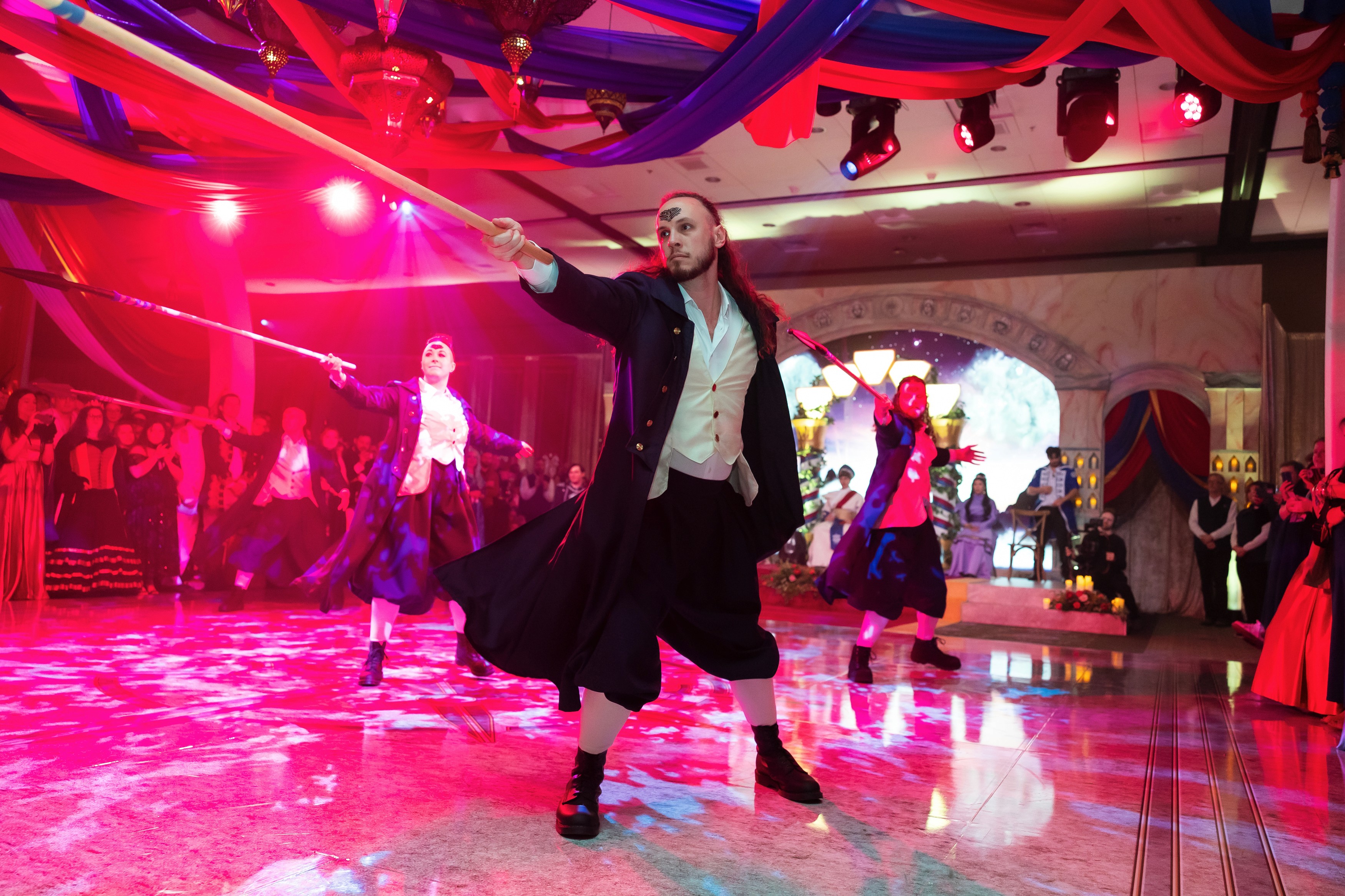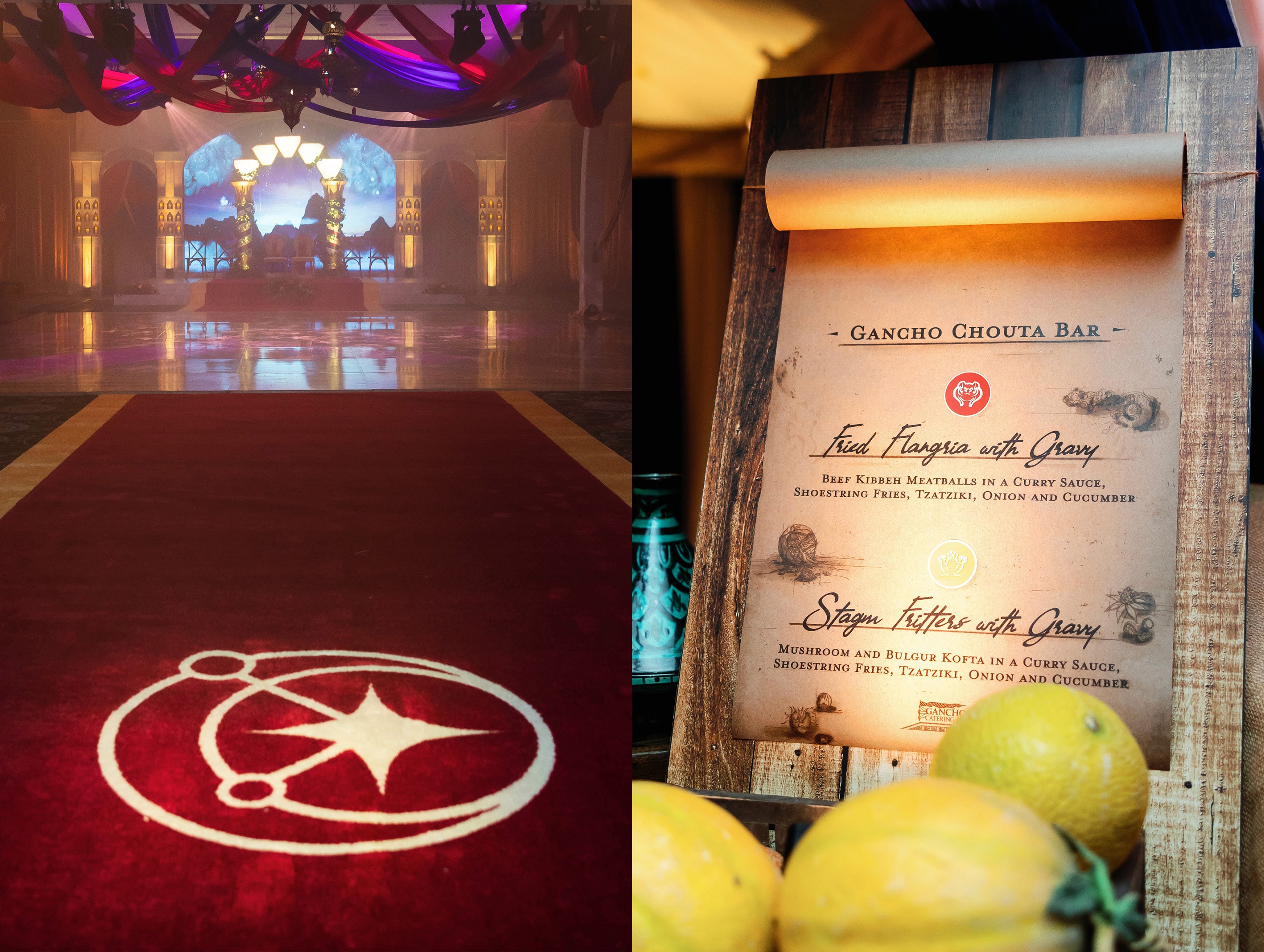 Guests were treated to an arched entryway made after the chapter titles in the books, a luminescent tunnel through Shadesmare, a dance floor under hanging drape and colorful lanterns, themed food and bar stations, a guestbook to the fictional couple, flash-paper burning station, performances by character actors, a kata group and aerialists, and an emo DJ set to cap off the night.
