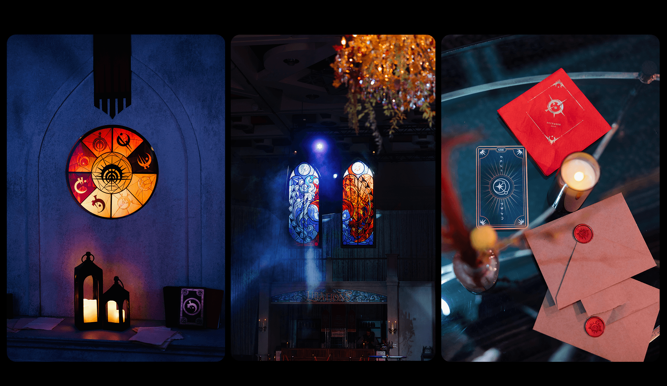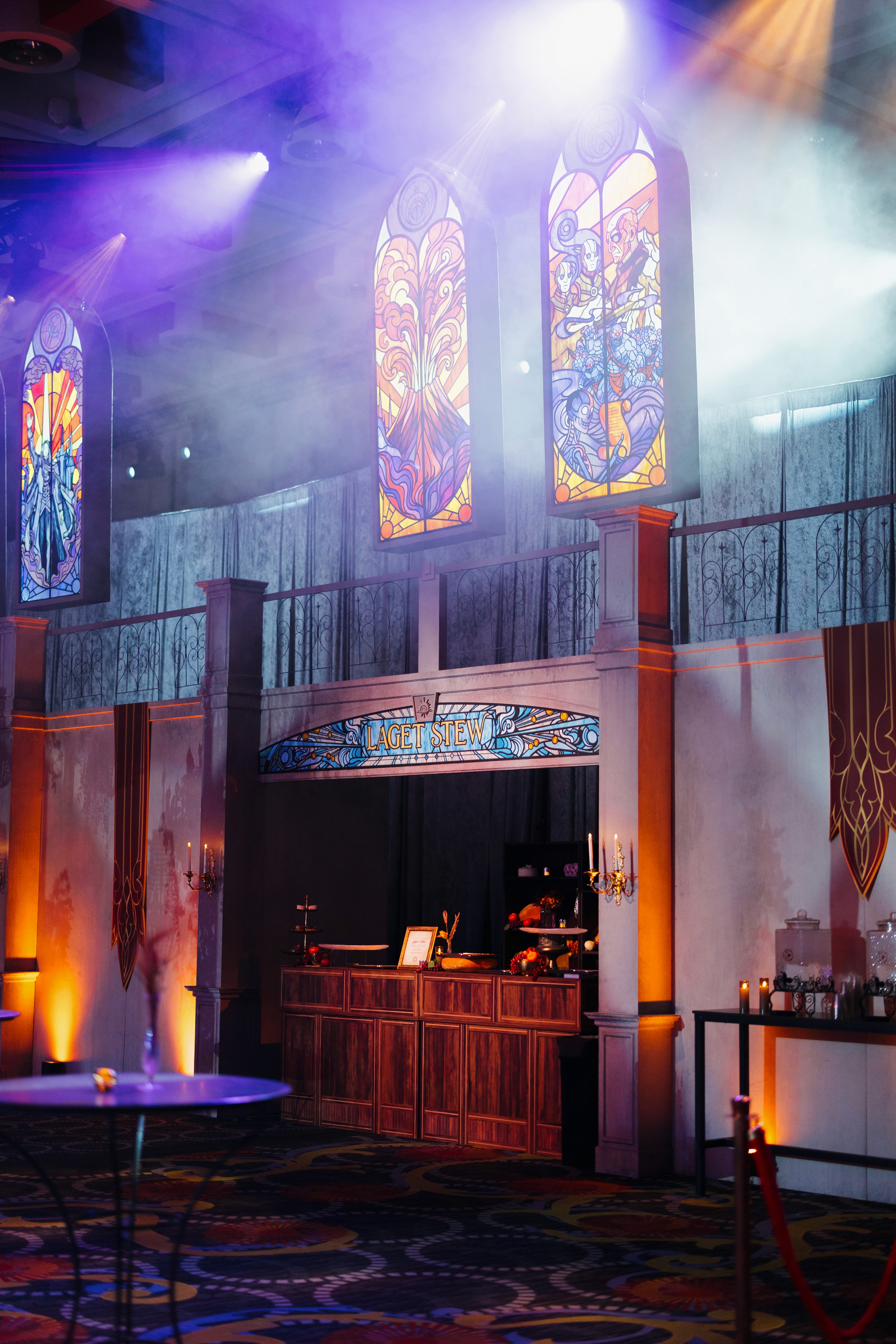 Brandon Sanderson's Mistborn series is arguably his most prolific work and it holds a very special place in the hearts of many fans. It was extremely important to us that we met those high expectations for the first live-action representation of the series. We leaned heavily into the late 19th-century European aesthetic of the world, drawing inspiration from Vienna, London, Prague, and pre-Revolution Paris. Our fully fabricated sets took months to design and covered over 300 linear feet space. Some were even built with balconies to imply the existence of a 2nd floor! We designed and built 16 massive stained glass windows which hung 26' in the air, and featured thematic food & beverage, event-exclusive giveaways, and a cast & performing group of 28 people.
