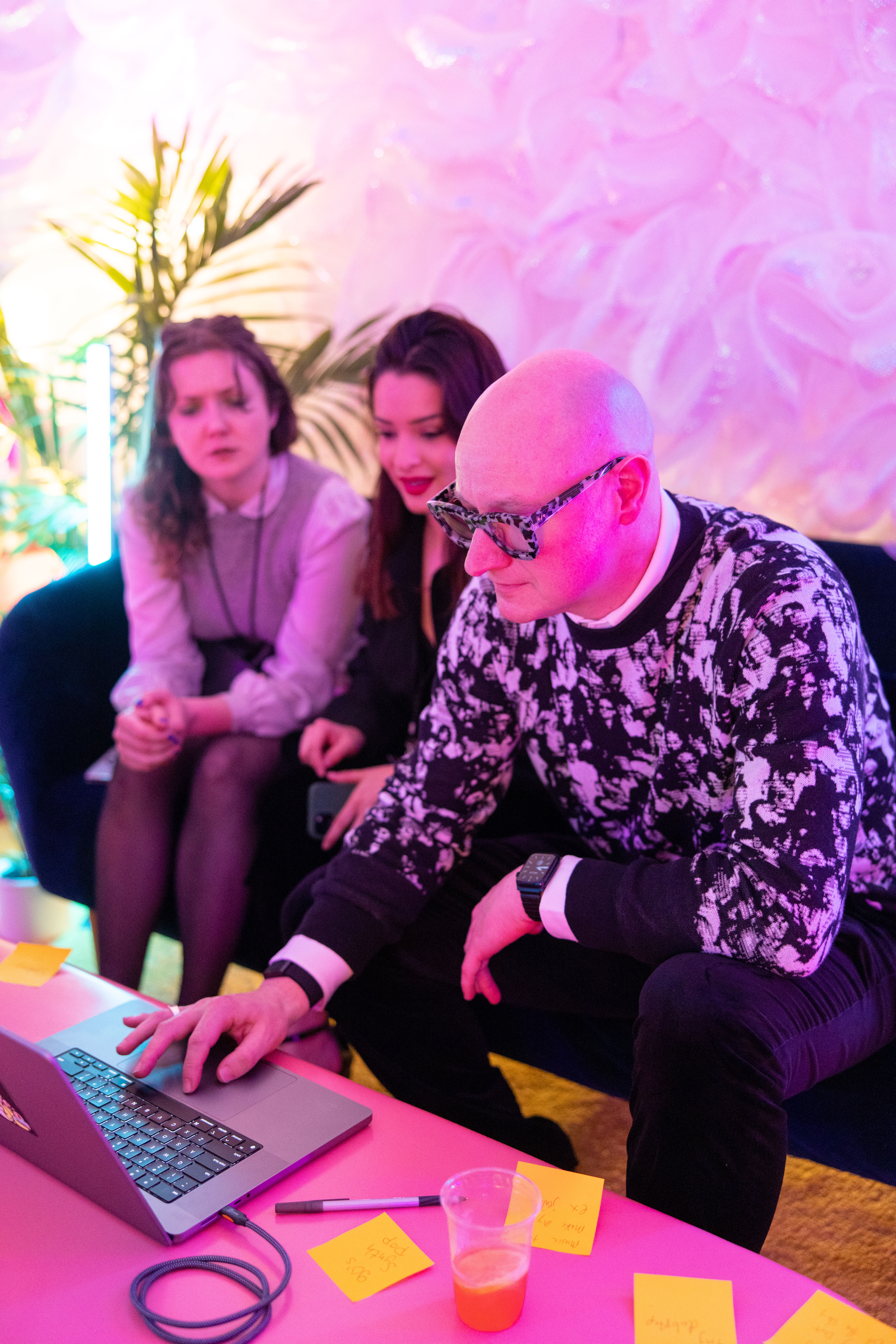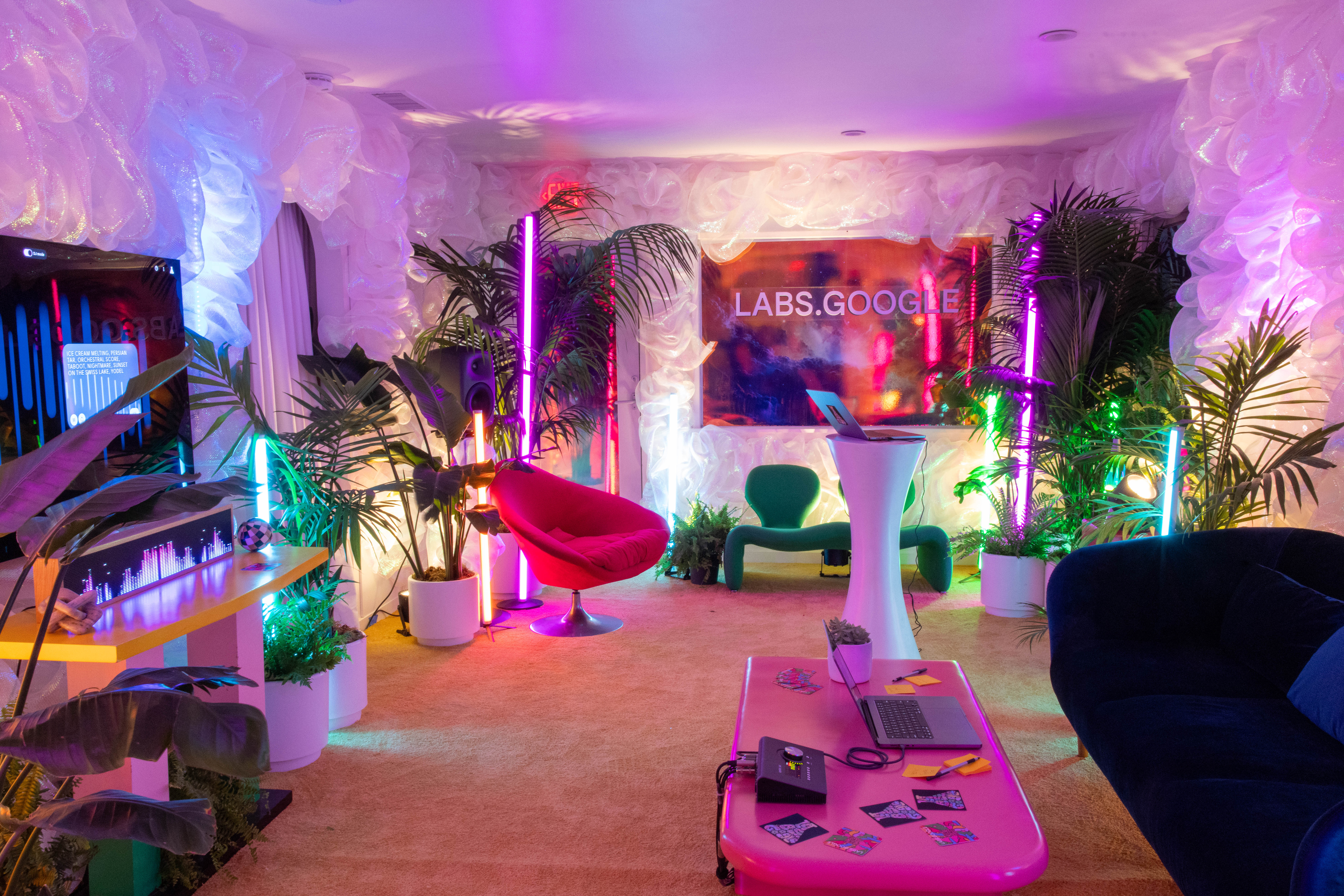 Inspired by the colors and materials from David Bowie’s Ziggy Stardust, Luc Besson’s The Fifth Element, and the magical costuming of Elton John, the Labs.Google room was a kaleidoscope of cosmic candy. For the very first time, lucky guests would be able to sync their own musical desires directly to the room itself - almost as if it had a mind of its own.